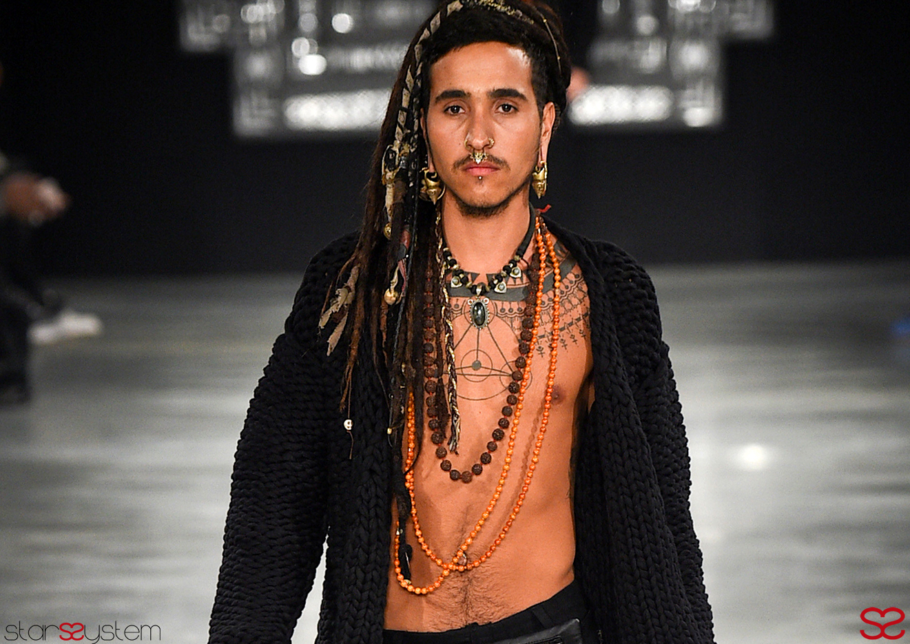 La sfilata per la collezione autunno-inverno 16/17 inizia con un vero e proprio rito propiziatorio tra lo sciamano e lo psichedelico, con tanto di cospargimento di incenso e invocazioni al Nord al Sud, all’Est e all’Ovest. L’effetto spettacolo anche questa volta è stato garantito.