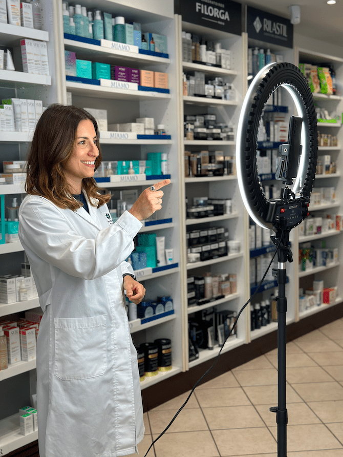E’ nata da una sfida che ha lanciato Costantino. Io non sono entrata subito nel progetto di promozione nel mondo social, c’erano altre colleghe. Loro hanno iniziato nel settembre 2022 e io sono entrata nell’Aprile 2023. É stato un esperimento che si voleva fare. All’inizio non si sapeva bene che taglio dare. Io per esempio ho cominciato senza neanche saperlo, un giorno mi hanno convocato nella farmacia di Cairoli e mi sono ritrovata a registrare il mio primo tik tok. Mi sentivo spiazzata (ride), pensavo di non esserne capace e invece è andata benissimo. Di natura sono una persona decisamente schietta, ironica e sui social credo sia importante parlare un linguaggio che arrivi a tutti anche a chi non ha fatto studi scientifici. Il mio intento era quello di farlo anche in chiave ironica, infatti all’inizio mi hanno affidato argomenti, come dire, “particolari“, sulla stitichezza e sulla “cacca” (ride).